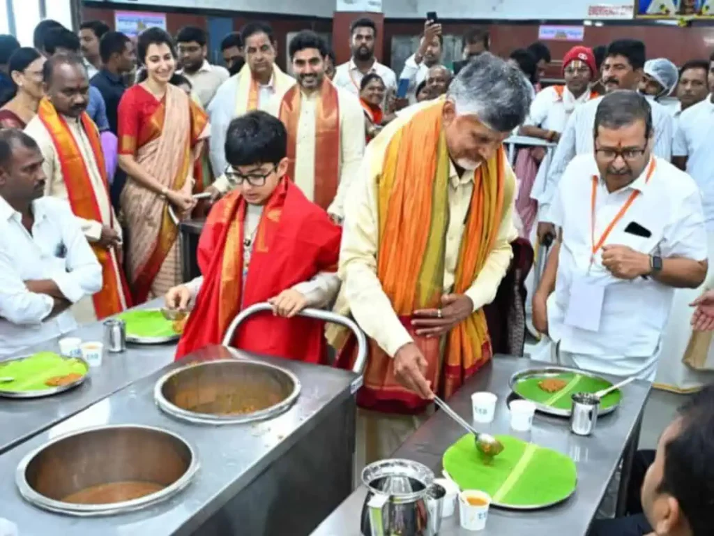 చంద్రబాబు, లోకేశ్, దేవాన్ష్ కలిసి స్వయంగా అన్నదాన కార్యక్రమంలో పాల్గొన్నారు. కుటుంబసభ్యులు ఐదుగురు కలిసి భక్తులతోపాటు అన్నం ప్రసాదంగా స్వీకరించారు. భక్తులంతా వీరి వినయాన్ని ప్రశంసించారు.
